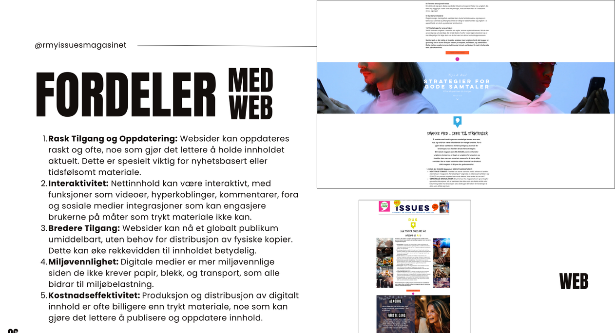 Et trykket magasin kan tilby en mer fokusert og personlig opplevelse, mens websider gir bredere og raskere tilgang til informasjon. Iddelt sett kan en kombinasjon av begge mediene brukes for å maksimere rekkevidde og engasjement. Vi i My ISSUES går for kombinasjonen!
