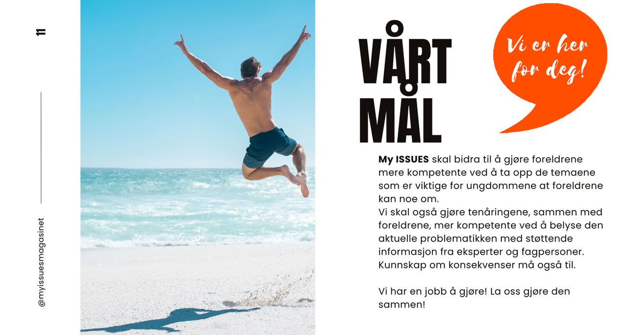My ISSUES tilbyr artikler, historier og råd som appellerer til ungdom og foreldre, fordi det er et magasin som tar opp temaer som er relevante for dem. Magasinet tilbyr en unik og interessant tilnærming til emner som handler om ungdom 13-19 år, med et personlig preg der ungdom selv er med på produksjon og innhold.
